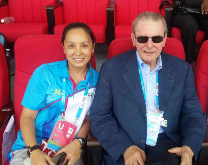 2014年8月19日,前国际奥林匹克委员会主席罗格一行参观青奥体育公园橄榄球场,南京广发(中国)副总经理朱照霞陪同参观。